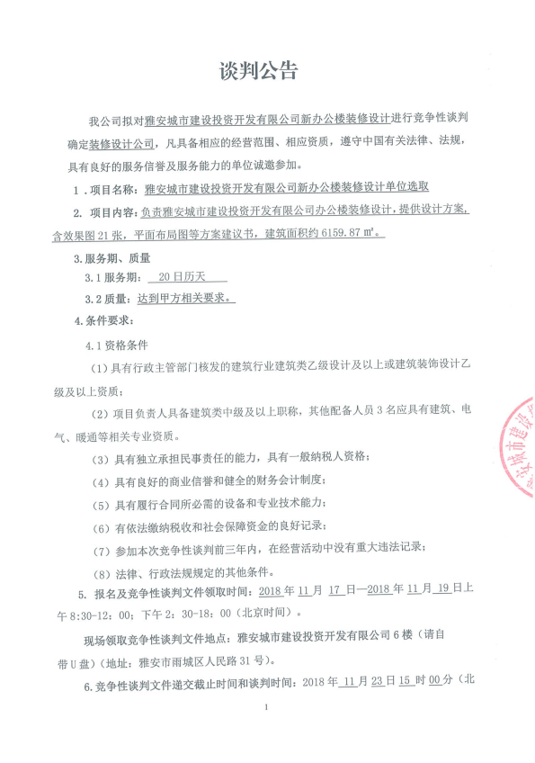 雅安城市建設(shè)投資開發(fā)有限公司新辦公樓裝修設(shè)計(jì)方案競(jìng)爭(zhēng)性談判