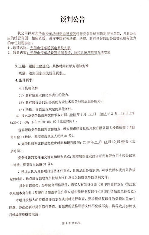 關(guān)于光華山停車(chē)場(chǎng)弱電系統(tǒng)安裝進(jìn)行競(jìng)爭(zhēng)性談判確定服務(wù)單位的邀請(qǐng)函