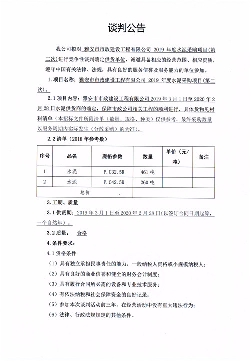 市政公司2019年度水泥采購項(xiàng)目(第二次)競爭性談判公告