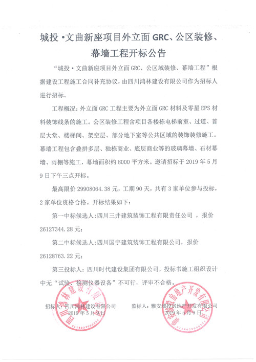 城投·文曲新座項(xiàng)目外立面GRC、公區(qū)裝修、幕墻工程開(kāi)標(biāo)公告