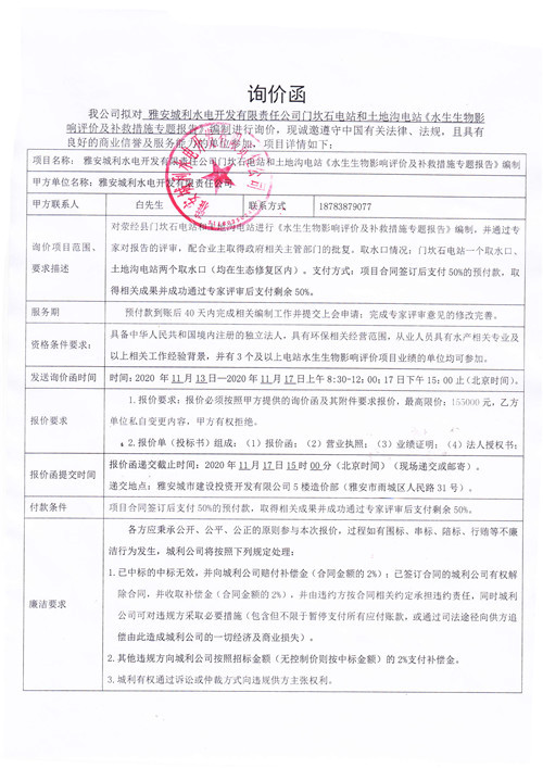 城利水電公司門(mén)坎石電站和土地溝電站《水生生物影響評(píng)價(jià)及補(bǔ)救措施專題報(bào)告》詢價(jià)函