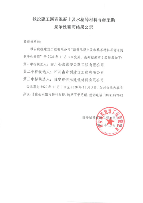 城投建工瀝青混凝土及水穩(wěn)等材料尋源采購(gòu)競(jìng)爭(zhēng)性磋商結(jié)果公示