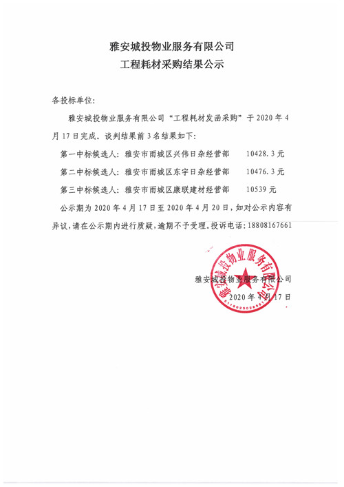 城投物業(yè)公司工程耗材采購結(jié)果公示
