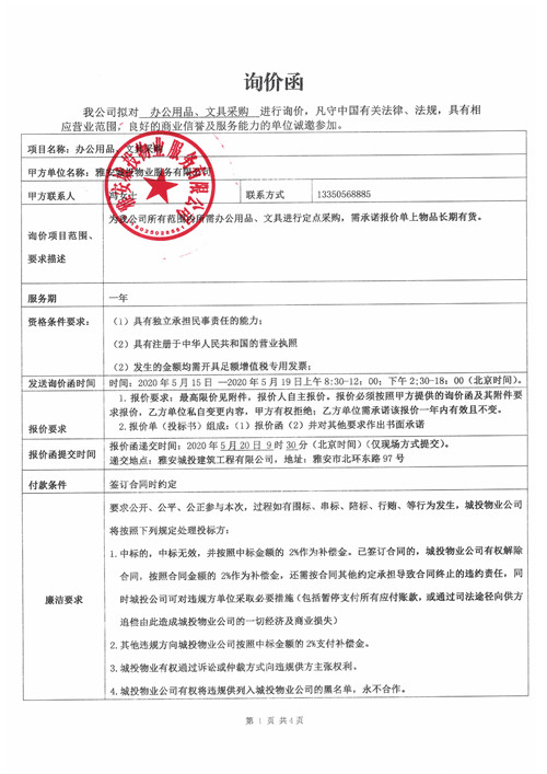 城投物業(yè)公司辦公用品、文具采購(gòu)詢價(jià)函