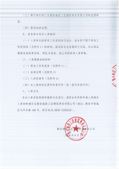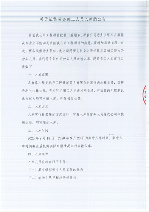 雅安城投工匠建筑勞務有限公司關于征集勞務施工人員入庫的公告