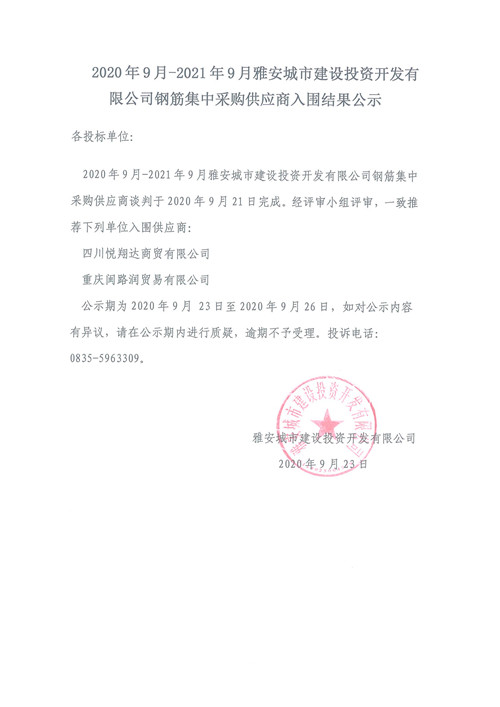 2020年9月-2021年9月雅安城市建設投資開發(fā)有限公司鋼筋集中采購供應商入圍結果公示