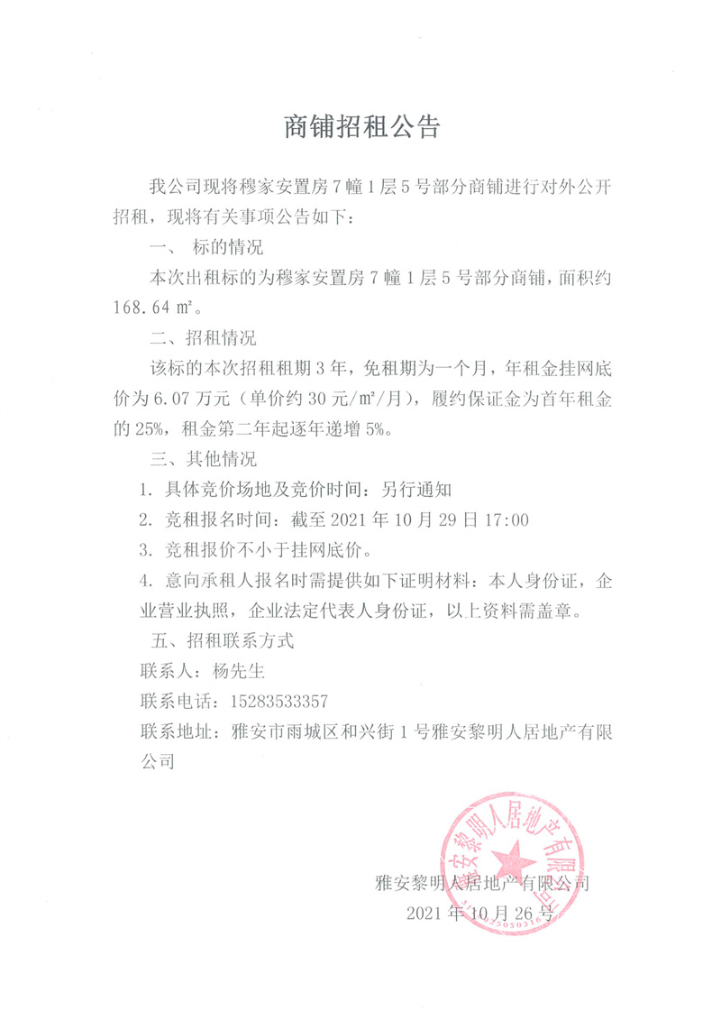 穆家安置房7幢1層5號部分商鋪招租公告