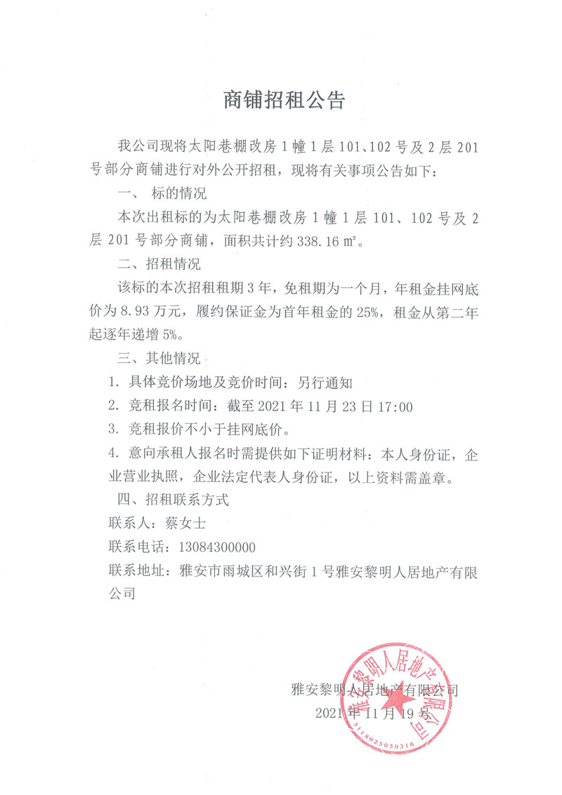 太陽(yáng)巷棚改房1幢1層101、102號(hào)及2層201號(hào)部分商鋪招租公告