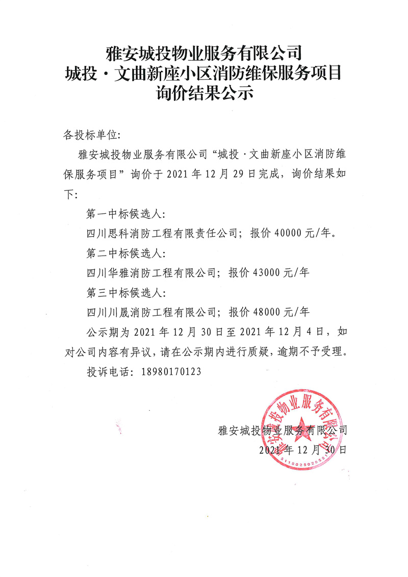 城投·文曲新座小區(qū)消防維保服務(wù)項(xiàng)目詢價(jià)結(jié)果公示