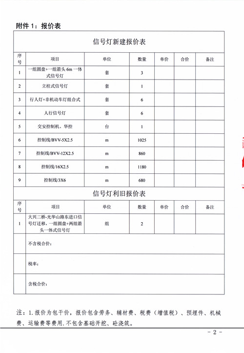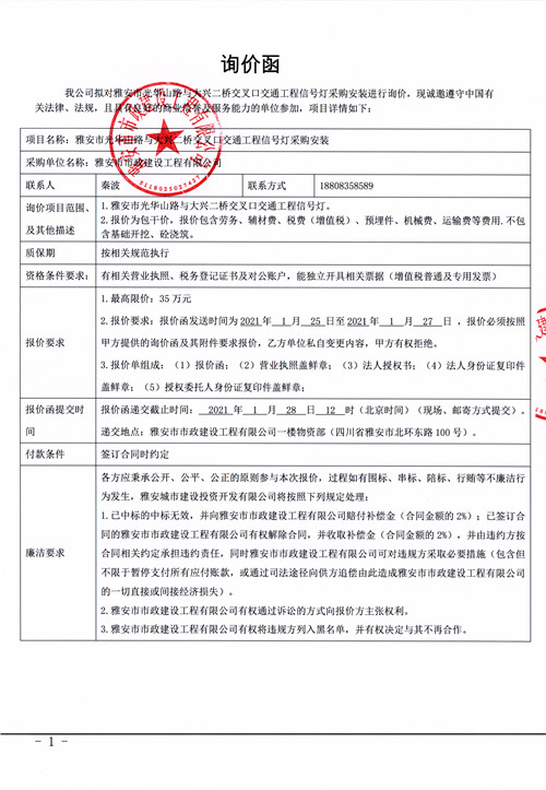 雅安市市政建設(shè)工程有限公司雅安市光華山路與大興二橋交叉口交通工程信號(hào)燈采購安裝詢價(jià)函