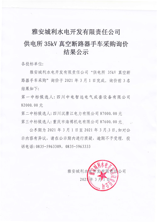 城利水電公司供電所35kV真空斷路器手車采購詢價(jià)結(jié)果公示