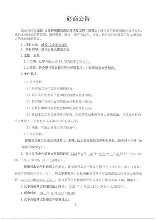 城投.文曲新座樓頂拆除及恢復工程競爭性磋商公告(第五次)