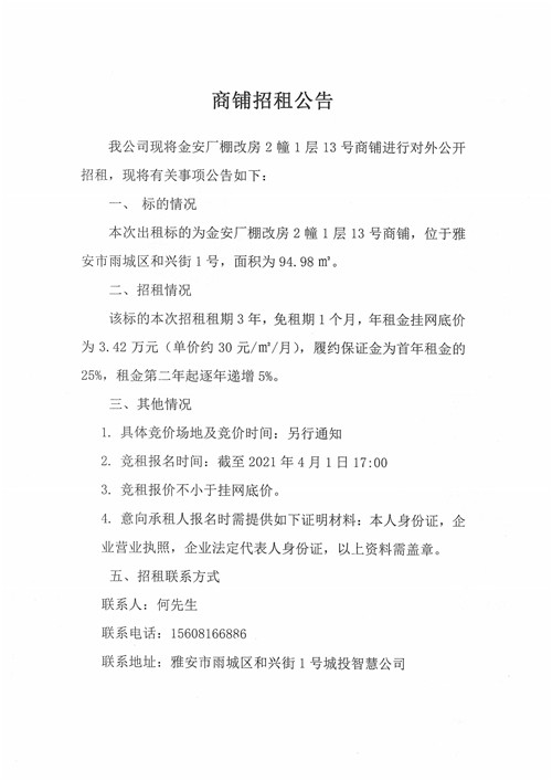 金安廠棚改房2幢1層13號(hào)商鋪招租公告