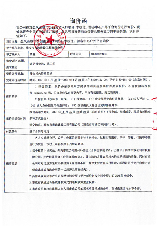 金鳳山城市公園南坡入口項(xiàng)目-木棧道、游客中心戶外平臺詢價(jià)函