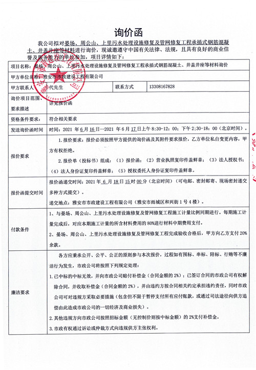 雅安城投市政公司晏場(chǎng)、周公山、上里污水處理設(shè)施修復(fù)及管網(wǎng)修復(fù)工程承插式鋼筋混凝土、井蓋井座等材料詢價(jià)函
