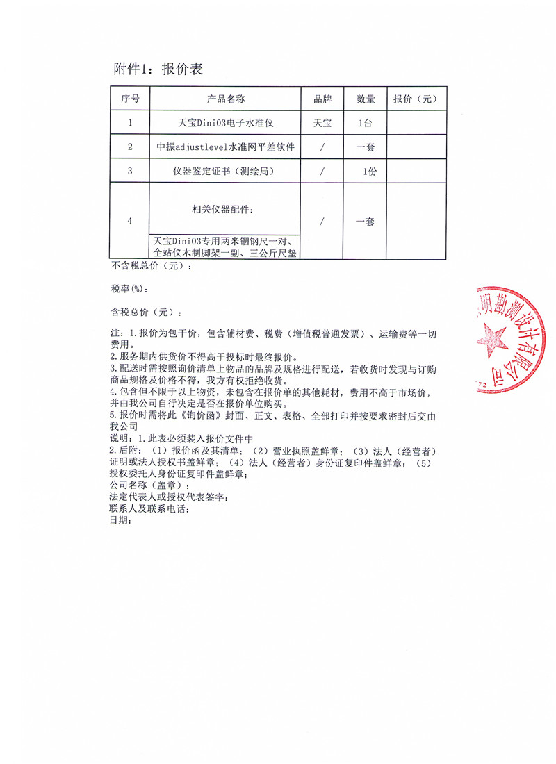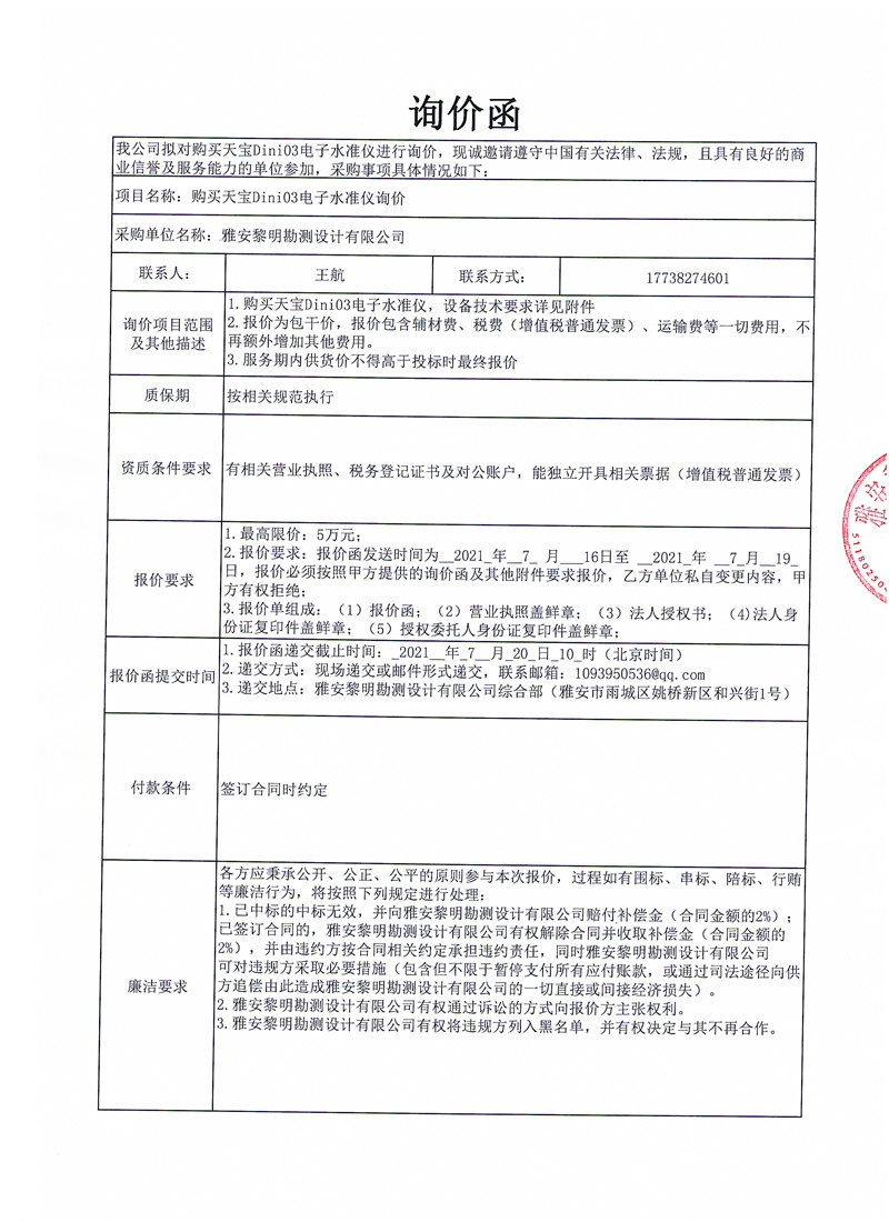 黎明勘測公司關(guān)于購買天寶Dini03電子水準(zhǔn)儀的詢價(jià)函