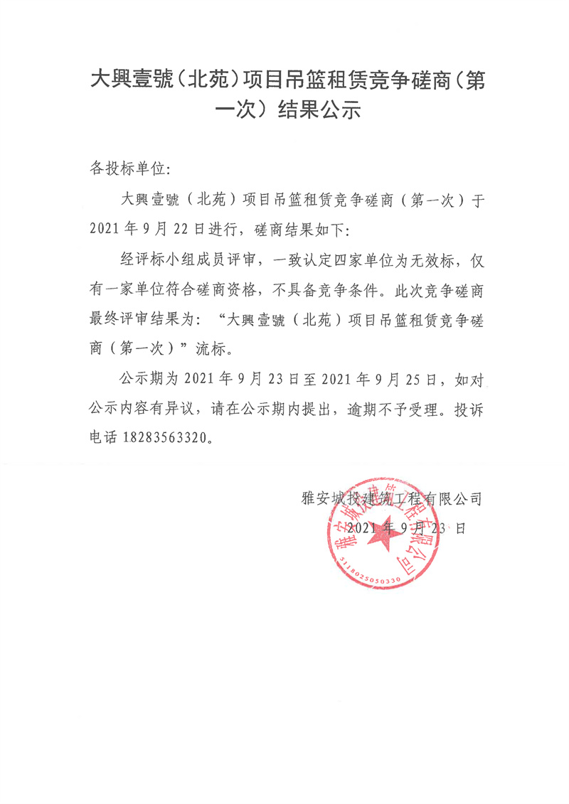 大興壹號(hào)(北苑)項(xiàng)目吊籃租賃競爭性磋商(第一次)結(jié)果公示