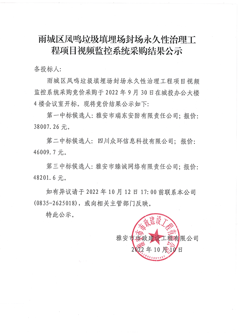 雨城區(qū)鳳鳴垃圾填埋場永久性封場治理工程項目視頻監(jiān)控系統(tǒng)采購結果公示