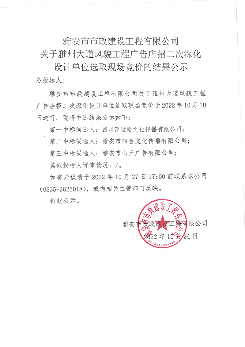 雅安市市政建設工程有限公司關于雅州大道風貌工程廣告店招二次深化設計單位選取現(xiàn)場競價的結果公示