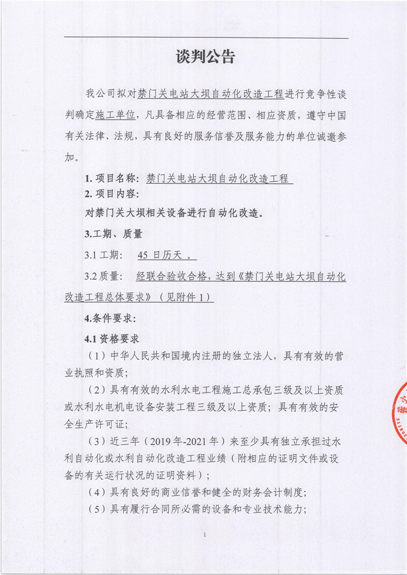 雅安城利水電公司禁門關(guān)電站大壩自動化改造工程競爭性談判公告