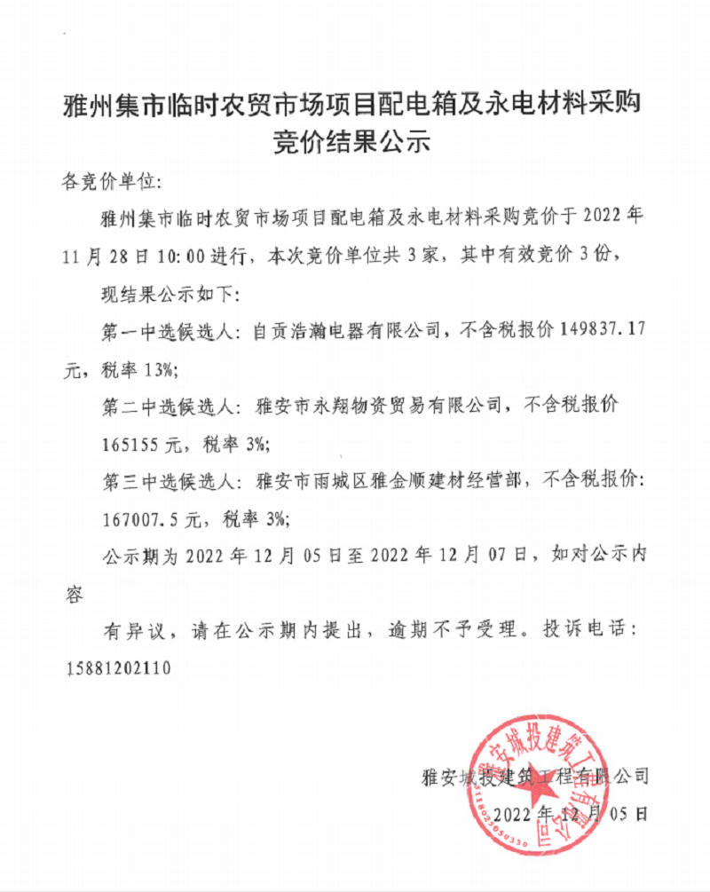 雅州集市臨時(shí)農(nóng)貿(mào)市場(chǎng)項(xiàng)目配電箱及永電材料采購競(jìng)價(jià)結(jié)果公示