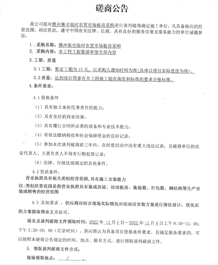 雅州集市臨時(shí)農(nóng)貿(mào)市場(chǎng)板房采購(gòu)磋商公告