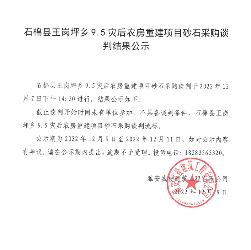 石棉縣王崗坪鄉(xiāng)9.5災后農(nóng)房重建項目砂石采購談判結果公示