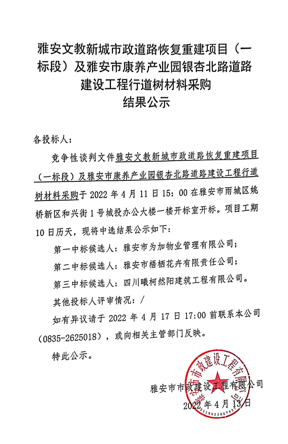雅安文教新城市政道路恢復(fù)重建項(xiàng)目(一標(biāo)段)及雅安市康養(yǎng)產(chǎn)業(yè)園銀杏北路道路建設(shè)工程行道樹材料采購結(jié)果公示