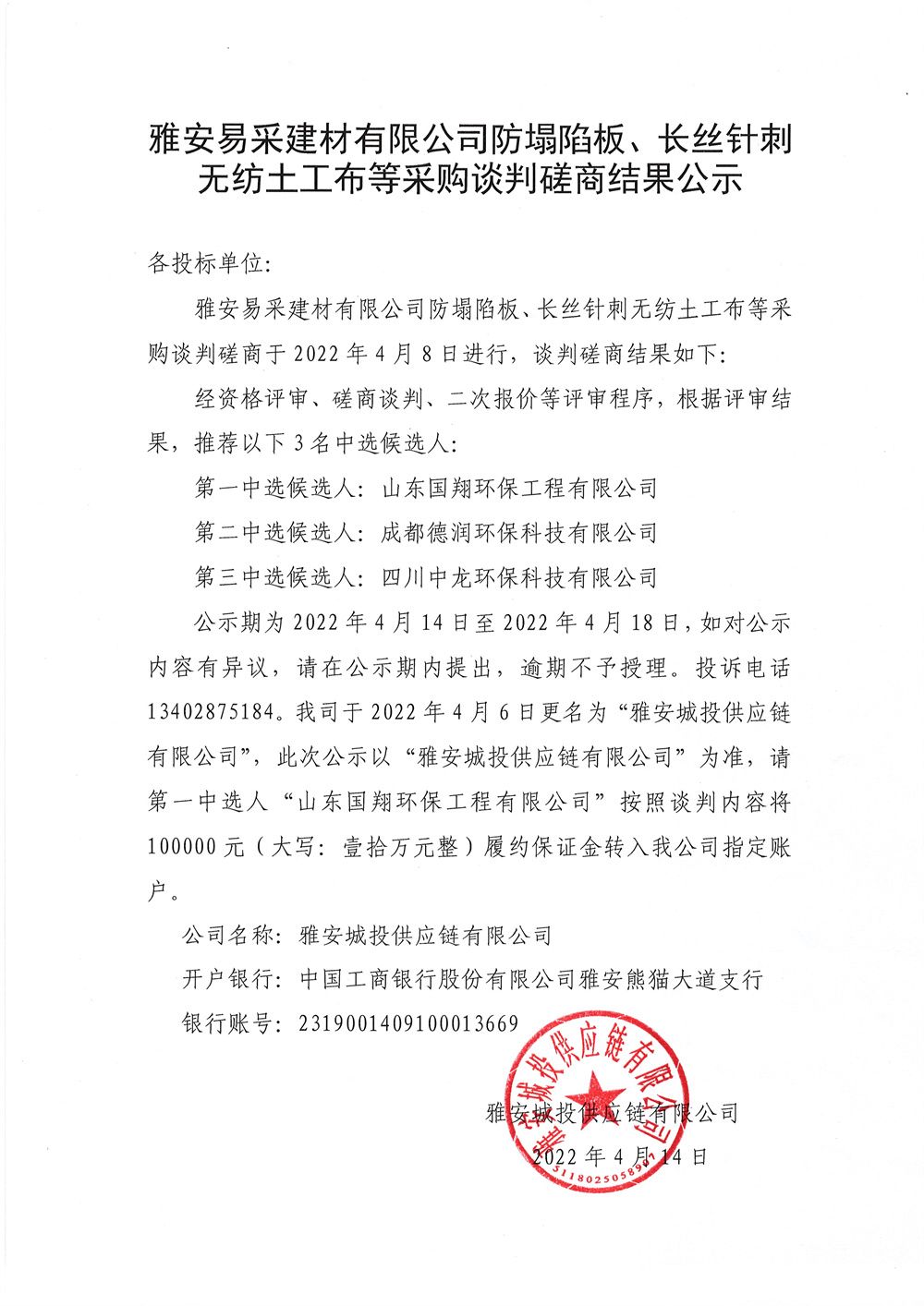雅安易采建材有限公司防塌陷排水板、長絲針刺無紡土工布等采購談判磋商結果公示