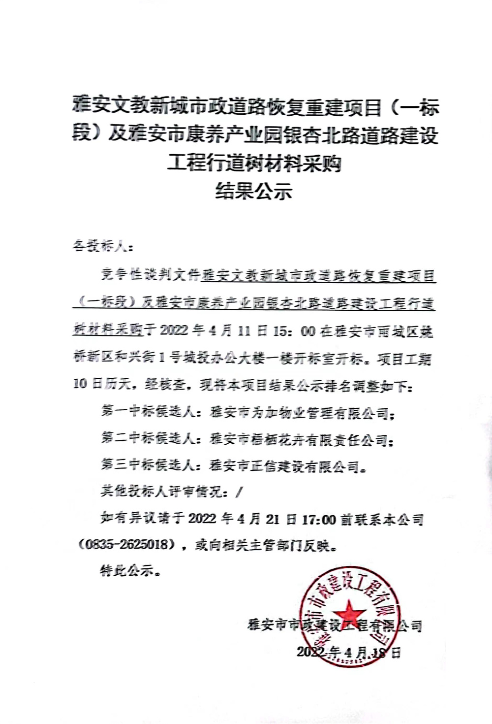 雅安文教新城市政道路恢復重建項目(一標段)及雅安市康養(yǎng)產(chǎn)業(yè)園銀杏北路道路建設(shè)工程行道樹材料采購結(jié)果公示