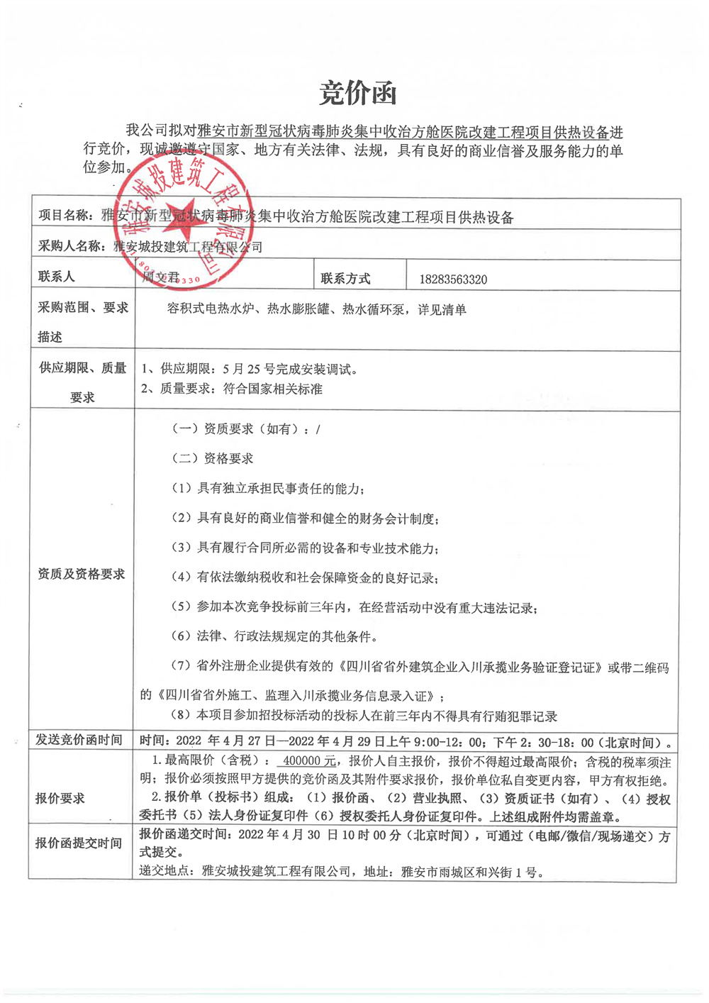 雅安市新型冠狀病毒肺炎集中收治方艙醫(yī)院改建工程項目供熱設備競價函