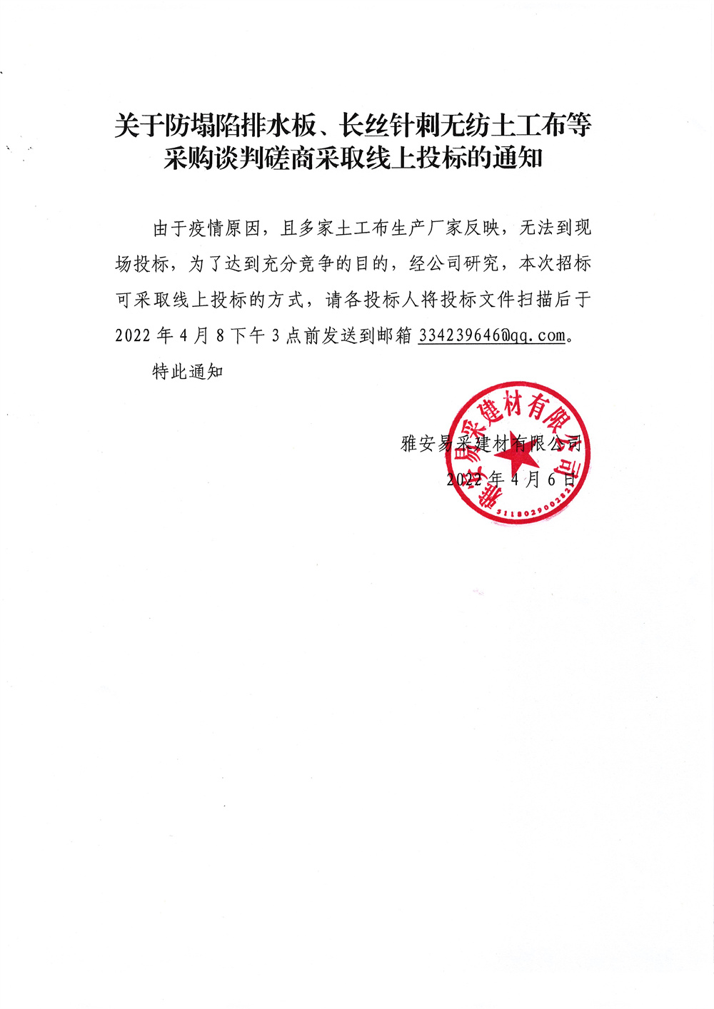 雅安易采建材有限公司防塌陷排水板、長絲針刺無紡?fù)凉げ嫉炔少徴勁写枭滩扇【上投標的通知