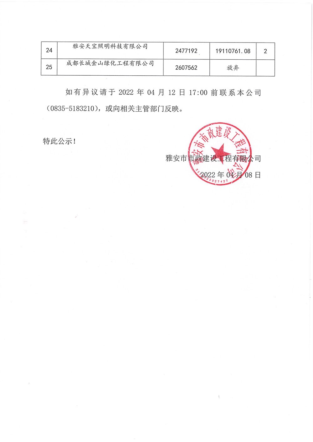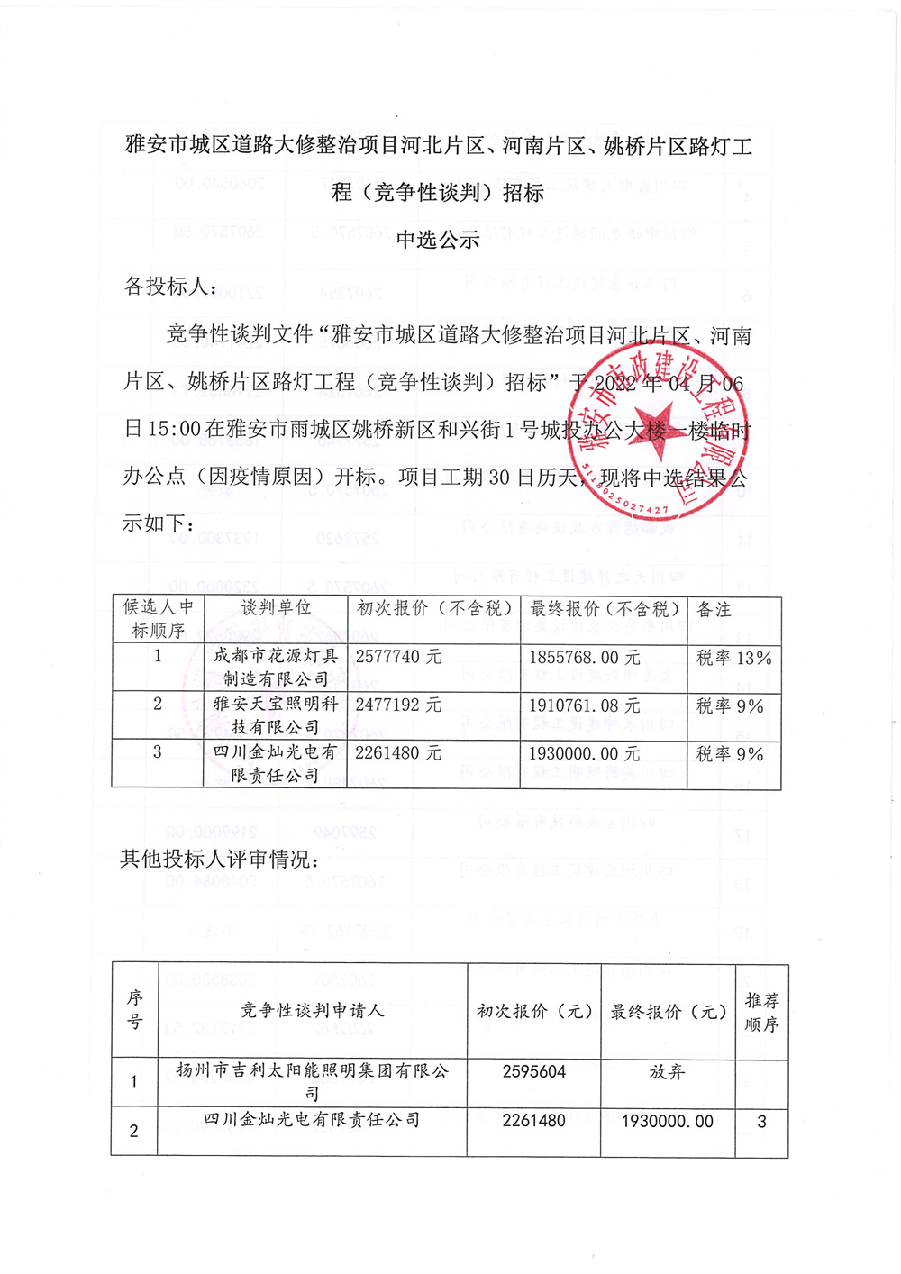 雅安市城區(qū)道路大修整治項(xiàng)目 河北片區(qū)、河南片區(qū)、姚橋片區(qū)路燈工程競(jìng)爭(zhēng)性談判招標(biāo)中選公示