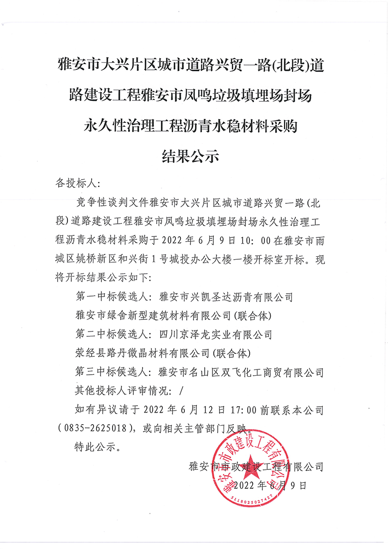 雅安市大興片區(qū)城市道路興貿(mào)一路(北段)道路建設(shè)工程雅安市鳳鳴垃圾填埋場(chǎng)封場(chǎng)永久性治理工程瀝青水穩(wěn)材料采購(gòu)結(jié)果公示