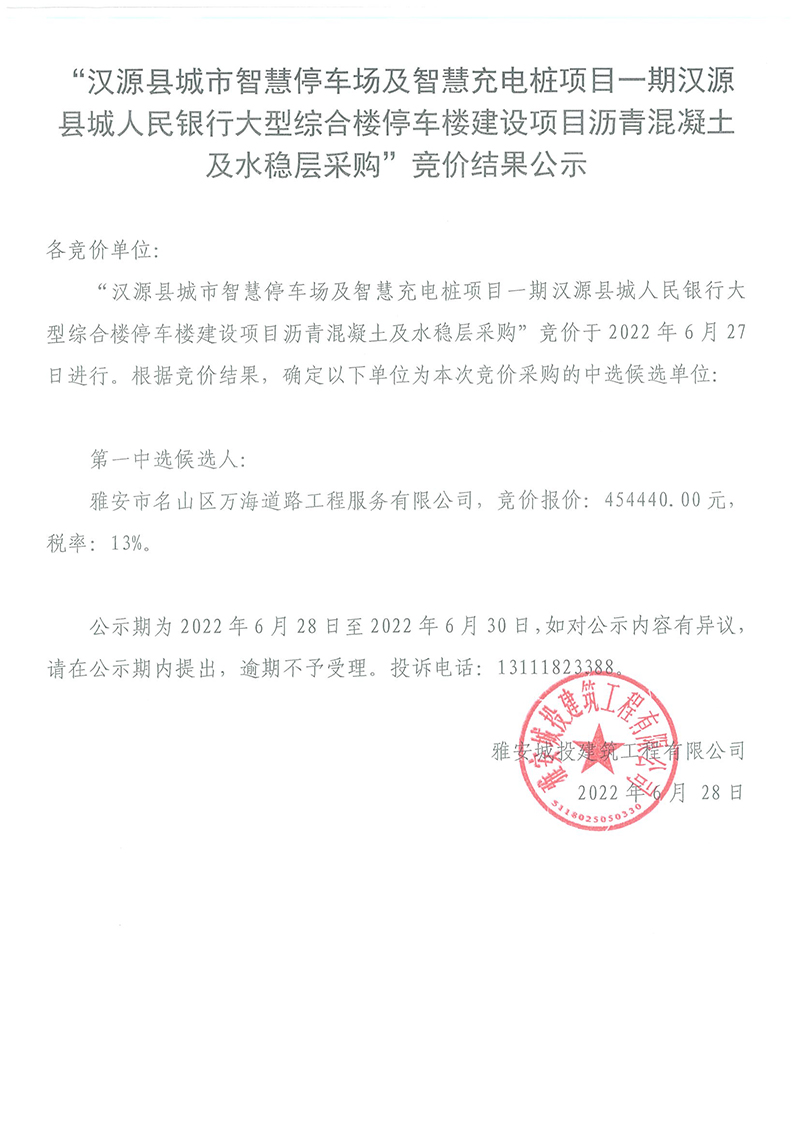 漢源縣城市智慧停車(chē)場(chǎng)及智慧充電樁項(xiàng)目一期漢源縣城人民銀行大型綜合樓停車(chē)樓建設(shè)項(xiàng)目瀝青混凝土、水穩(wěn)層采購(gòu)競(jìng)價(jià)結(jié)果公告