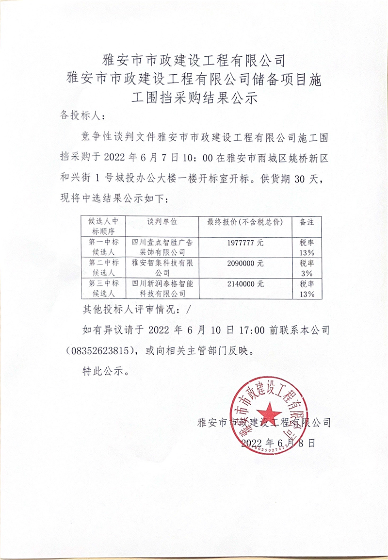 雅安市市政建設(shè)工程有限公司儲(chǔ)備項(xiàng)目施工圍擋招采結(jié)果公示