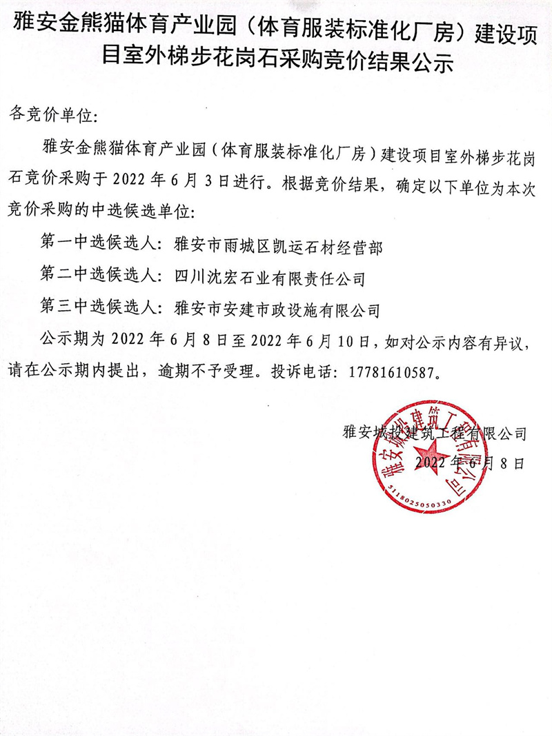 雅安市金熊貓?bào)w育產(chǎn)業(yè)園標(biāo)準(zhǔn)化廠(chǎng)房項(xiàng)目室外梯步花崗石采購(gòu)競(jìng)價(jià)結(jié)果公示