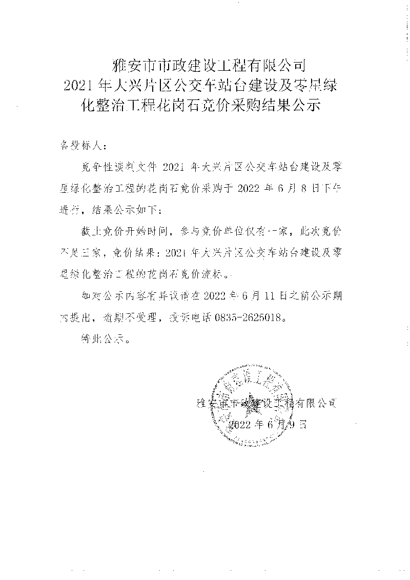 2021年大興片區(qū)公交站臺建設(shè)及零星綠地整治工程花崗石競價采購結(jié)果公示
