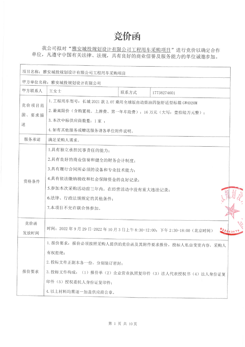 雅安城投規(guī)劃設計有限公司工程用車采購項目競價公告