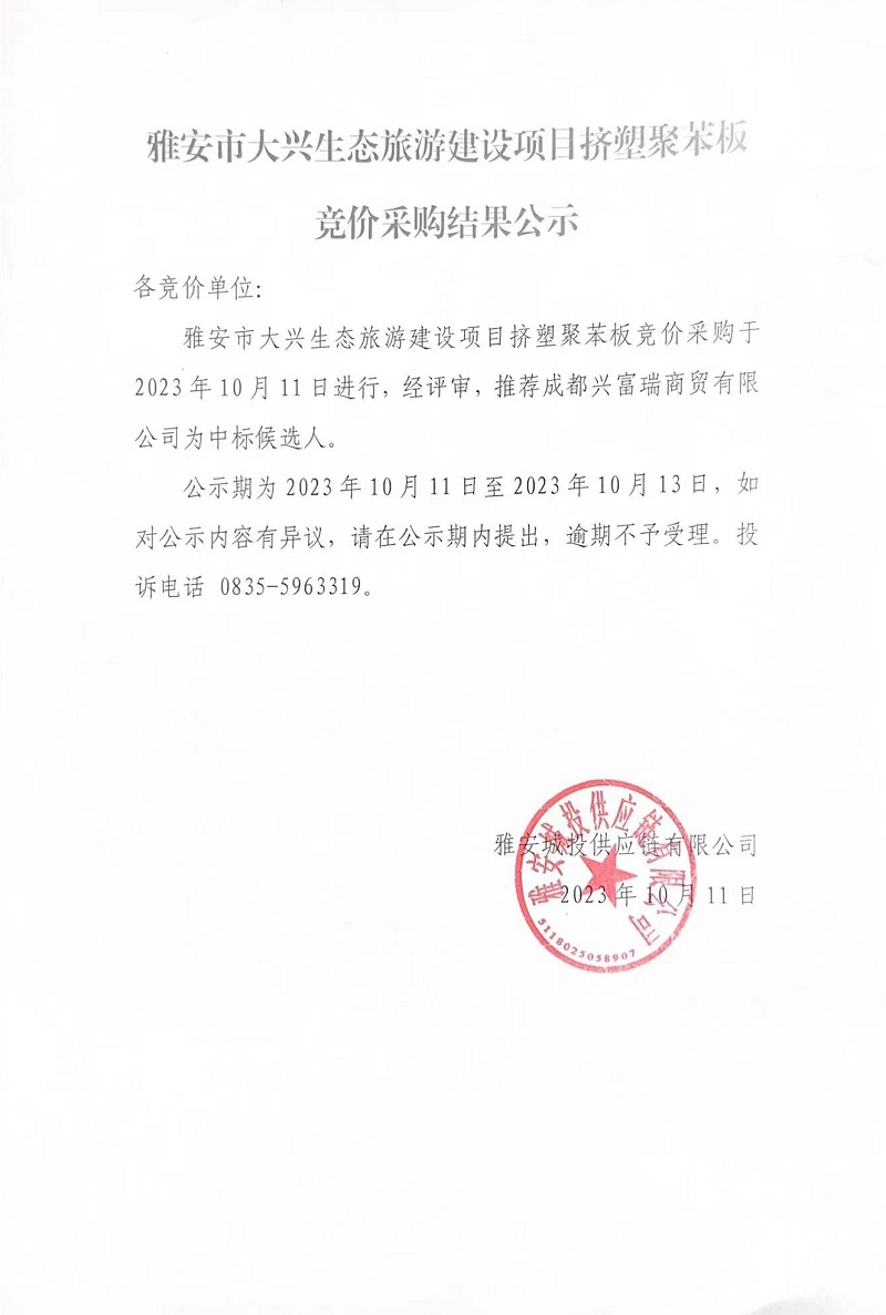 雅安市大興生態(tài)旅游建設(shè)項目擠塑聚苯板競價采購結(jié)果公示