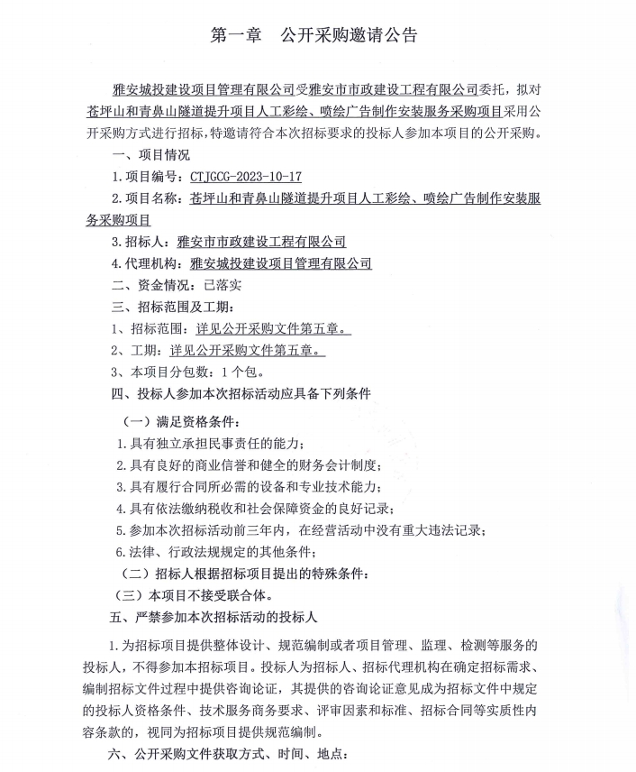蒼坪山和青鼻山隧道提升項(xiàng)目人工彩繪、噴繪廣告制作安裝服務(wù)采購項(xiàng)目公開采購邀請公告