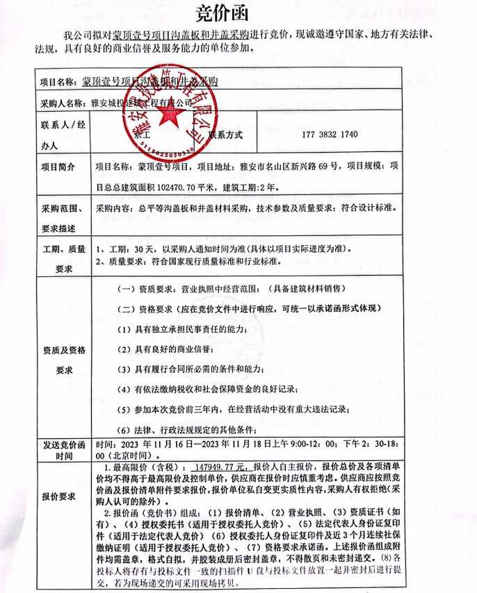 蒙頂壹號項目溝蓋板和井蓋采購競價公告