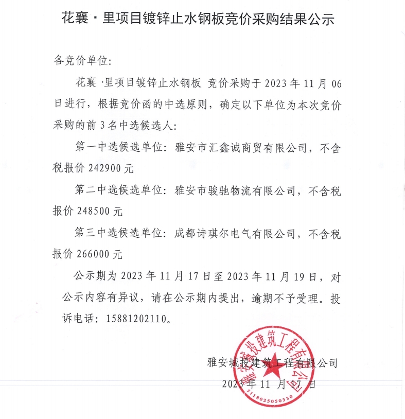 花襄·里項(xiàng)目鍍鋅止水鋼板競價(jià)采購結(jié)果公示