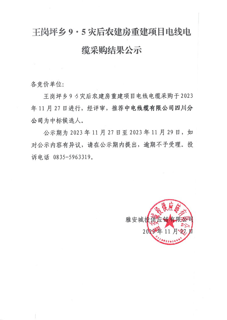王崗坪鄉(xiāng)9·5災(zāi)后農(nóng)建房重建項(xiàng)目電線電纜采購結(jié)果公示