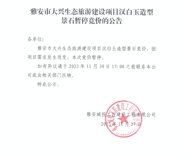 雅安市大興生態(tài)旅游建設項目漢白玉造型景石暫停競價的公告