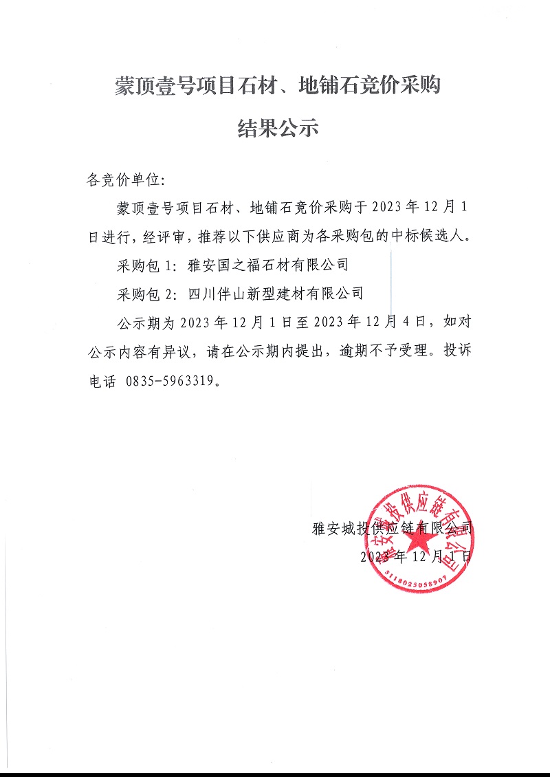蒙頂壹號項(xiàng)目石材、地鋪石競價(jià)采購結(jié)果公示