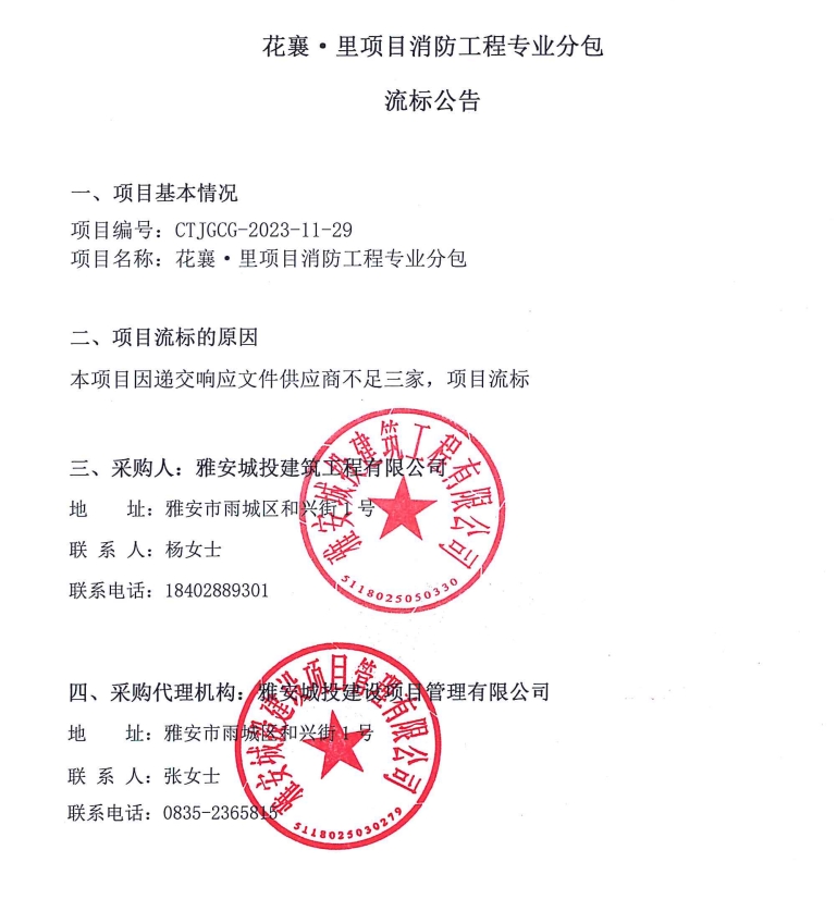 花襄·里項(xiàng)目消防工程專(zhuān)業(yè)分包流標(biāo)公告