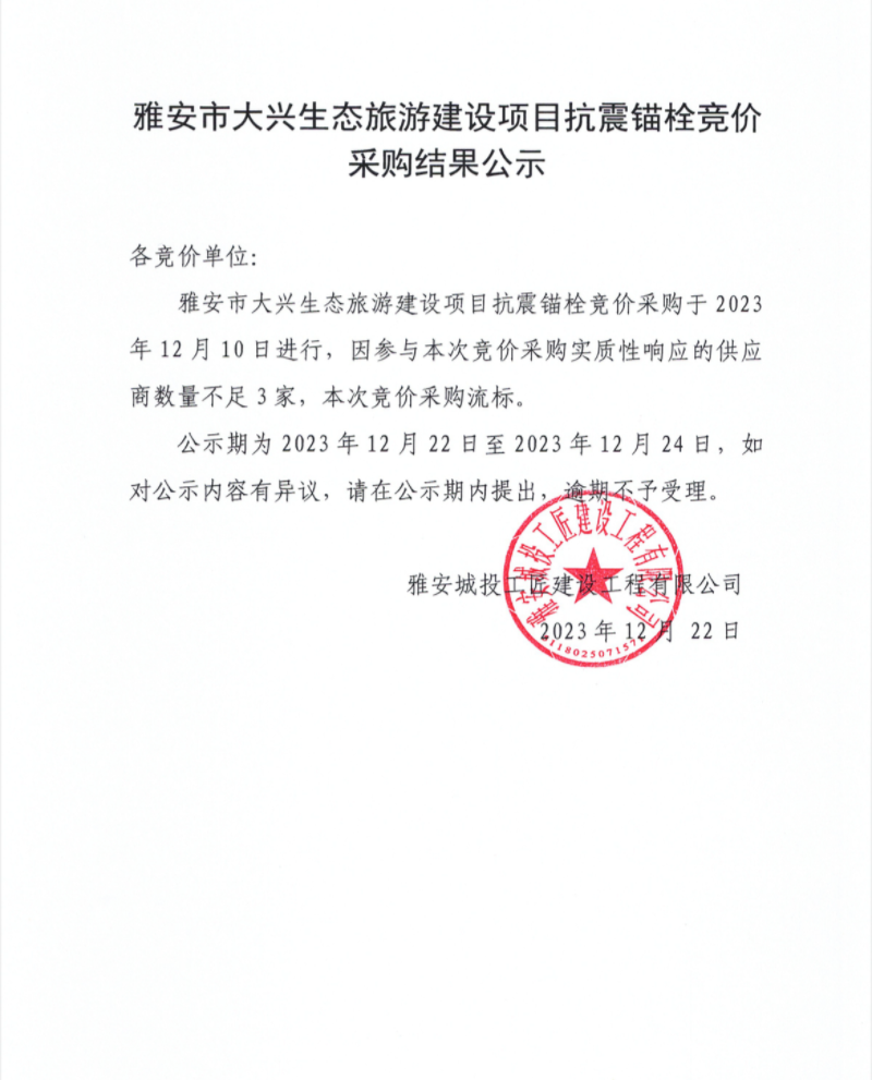 雅安市大興生態(tài)旅游建設項目抗震錨栓競價采購結果公示