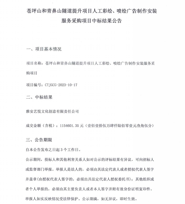 蒼坪山和青鼻山隧道提升項目人工彩繪、噴繪廣告制作安裝服務采購項目中標結(jié)果公告