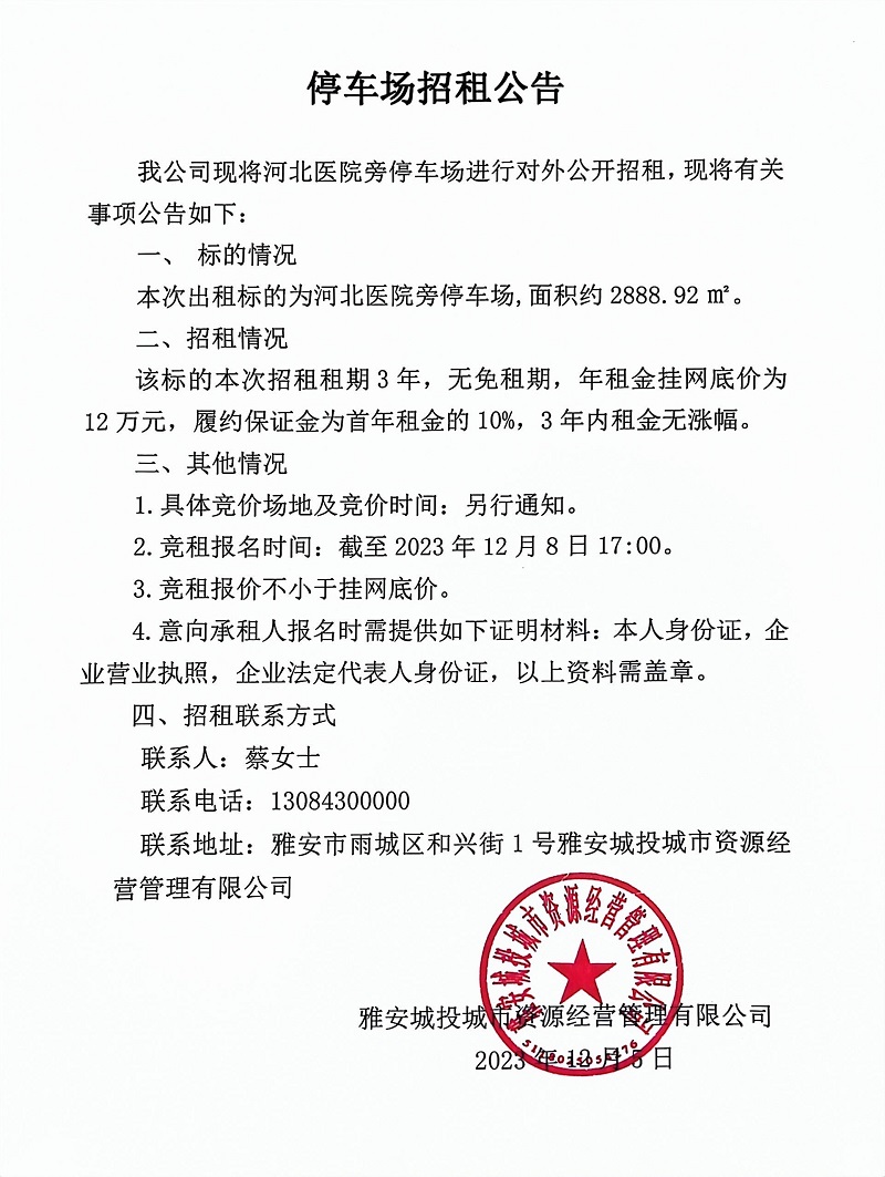 河北醫(yī)院旁停車(chē)場(chǎng)招租公告